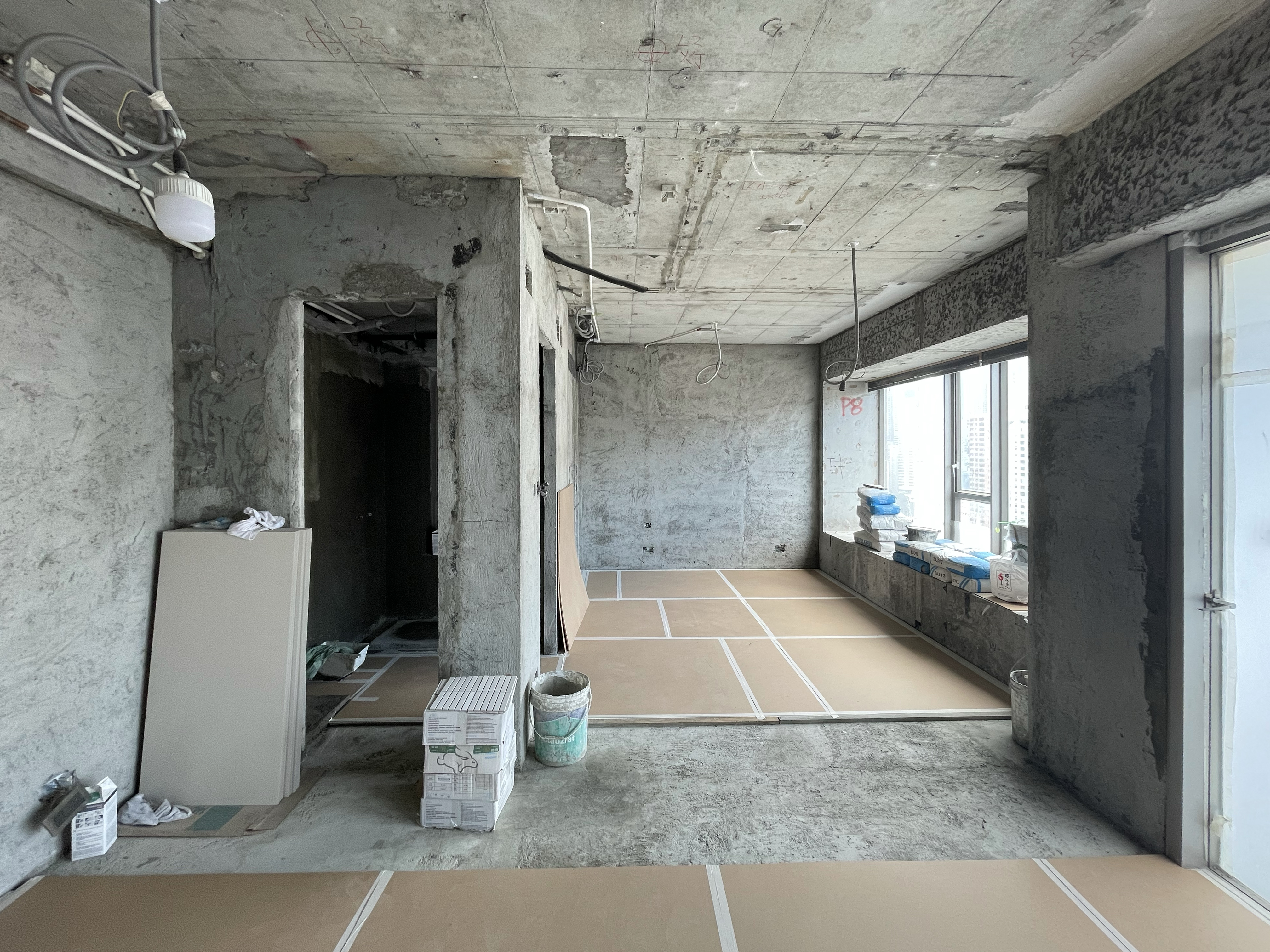 因此,設計團隊在項目伊始首先反思「房間」作為居住空間基本單元的慣常操作。通過打破「臥室、客廳、餐廳、衛生間」等房間編碼,設計拆除全部內牆,將一組的可移動門板系統與衣櫃和櫥櫃等配置成一組「T 形」裝置,並重新定義出三種居住空間類型——聚會空間、休憩空間、清潔空間。每種空間對應配置一種材料:白色網紙、木材和不鏽鋼。設計由此消除內部走廊並打破香港高層住宅的常見布局:居者並非先進入房間中心然後通過走廊向外輻射到各個房間,而是可以享有整個住宅里的多層空間。整個居住空間保持透明,突破對居住空間開放性的傳統界限,同時又允許居者自由定義不同的空間私密度。